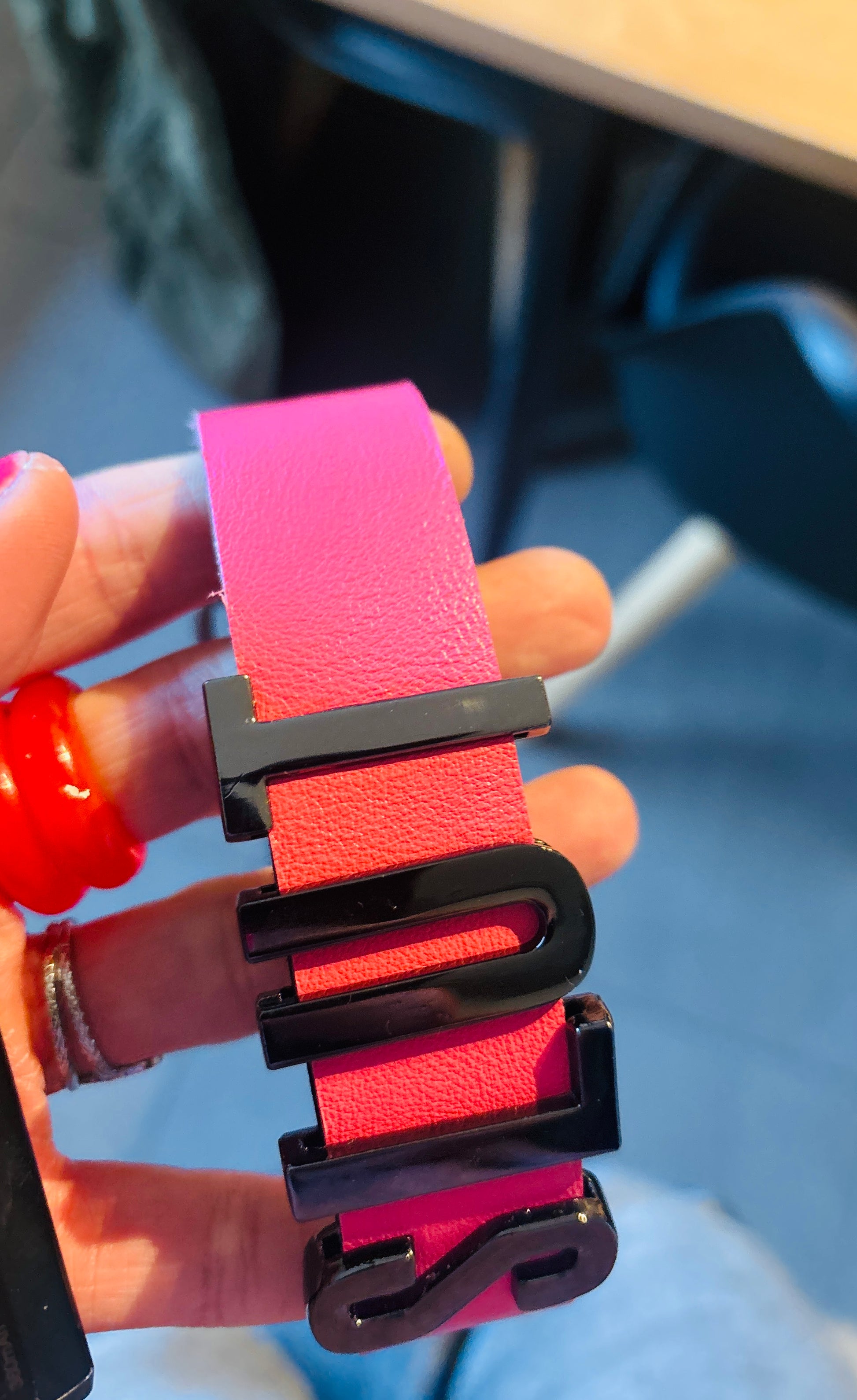De Lettering Luxe – Pink Edition is een elegante power-choker voor wie het graag zoet verpakt maar met een duidelijke ondertoon. De band wordt volledig met de hand gemaakt uit hoogwaardig echt leer, soepel genoeg om comfortabel te dragen maar stevig genoeg om de luxe metalen letters moeiteloos te dragen.