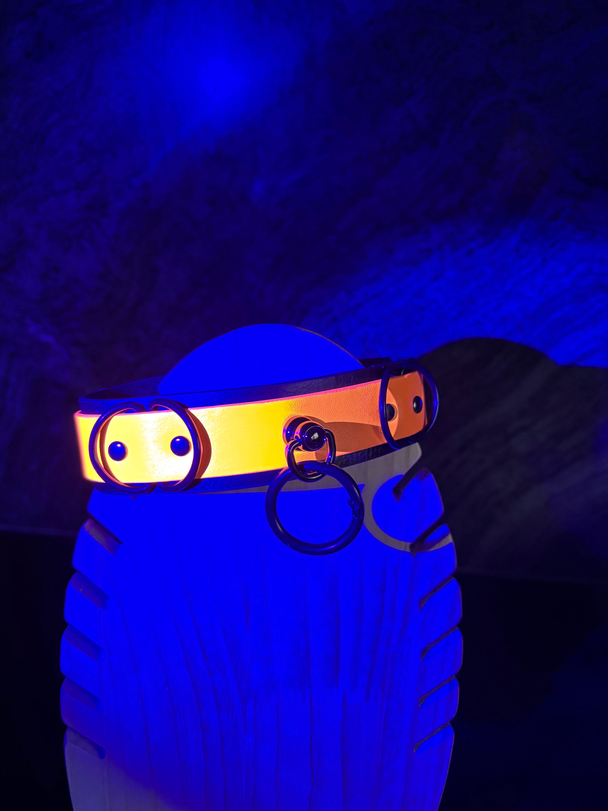 Deze brede (33mm), zwarte halsband is standaard voorzien van een dunne fluo streep in het midden die oplicht onder blacklight. Wil u toch liever een andere kleur voor over het zwart? Tegen een kleine meerkost ga ik voor jou op zoek naar exact die kleur die jij wil & maak deze choker volledig naar jou wens!