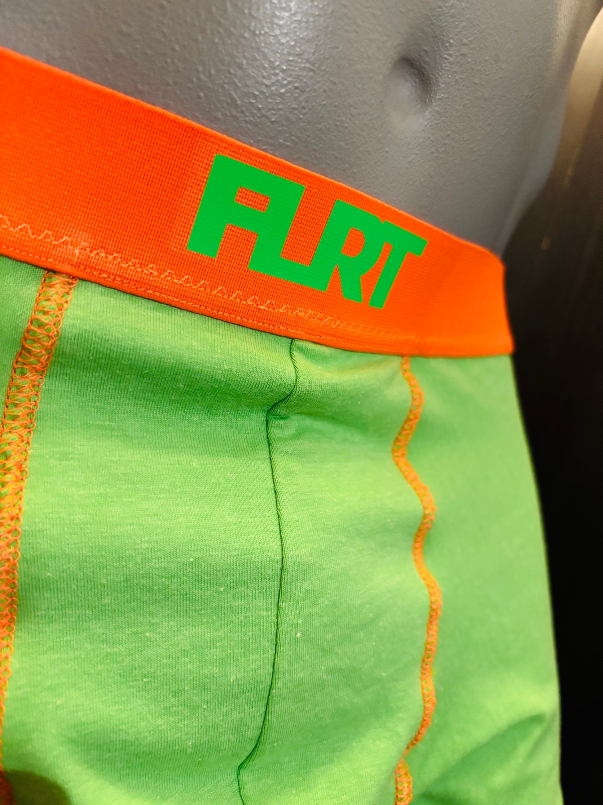 Neon groen met neon oranje details: de FLRT Toxic Pop knalt all the way—onder blacklight én overdag.
