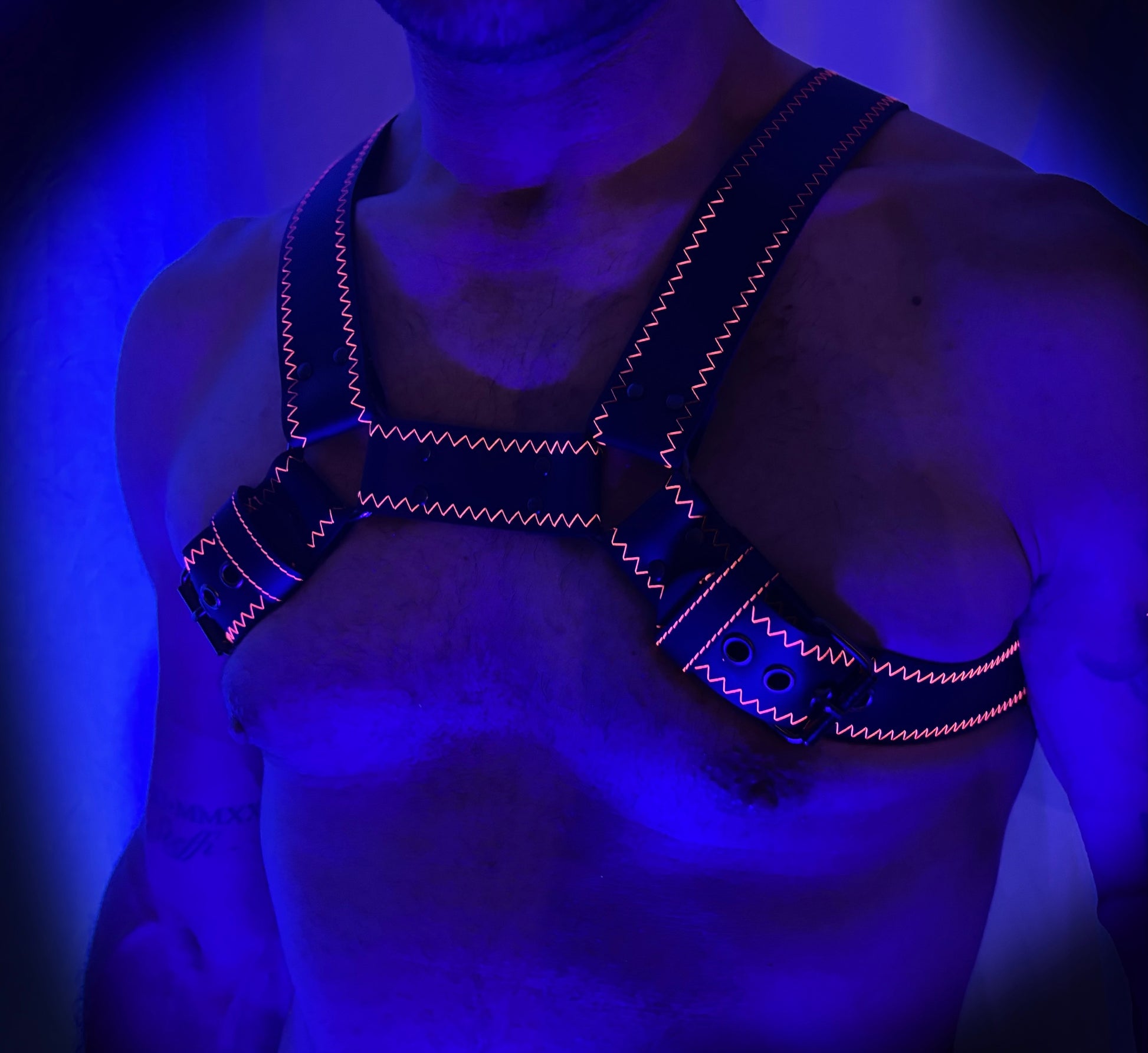 Deze krachtige borstharnas is handgemaakt uit echt zwart leer en straalt pure stijl uit. De opvallende zigzagstiksels in neon – kies uit groen, roos, oranje of geel – geven het een edgy clubwear vibe met een knipoog naar fetish fashion. De brede leren banden zorgen voor een stevige en comfortabele fit, terwijl metalen gespen het geheel afwerken met een stoere, mannelijke touch.